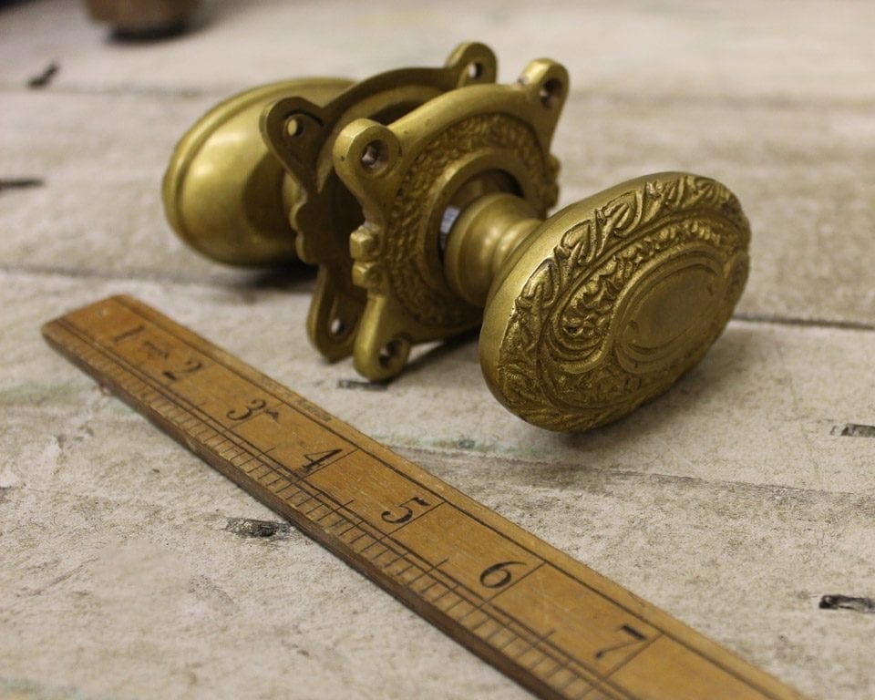 Celebrate early-20th-century design with this Art Nouveau door knob set, featuring a graceful oval profile (75 mm x 50 mm) for a comfortable, stylish grip. Crafted from solid brass and finished in a rich antique brass patina, it showcases the flowing curves and organic detailing characteristic of the Art Nouveau period.