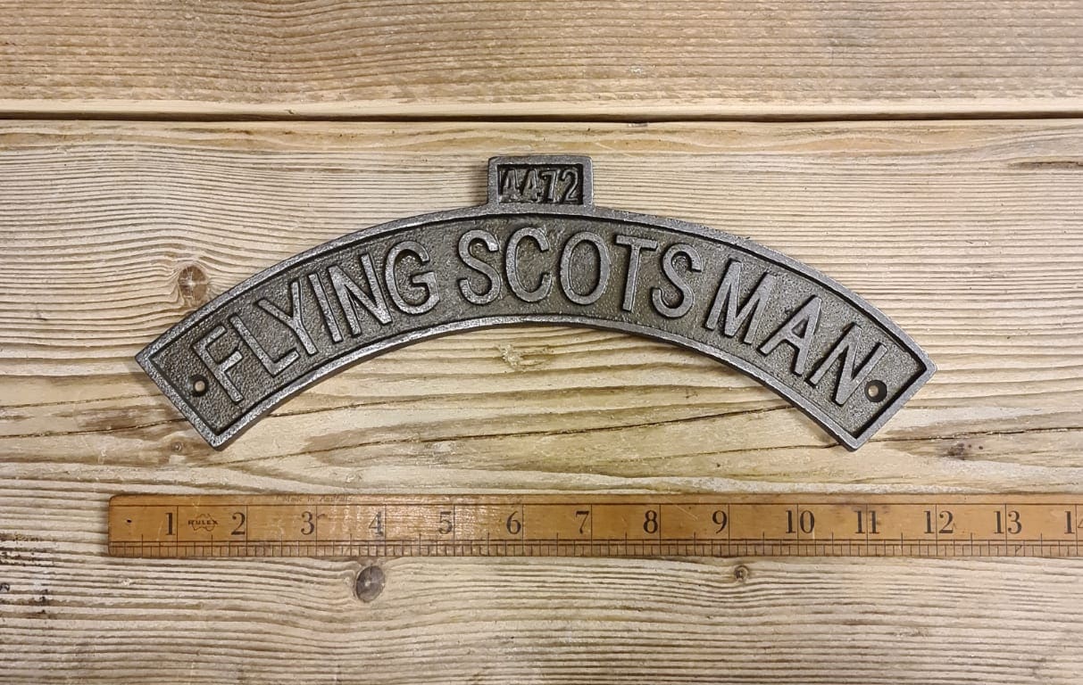 Celebrate the legacy of one of the worldโs most iconic locomotives with this “FLYING SCOTSMAN” curved sign. Expertly cast in solid iron and finished with a rich antique patina, this plaque measures 300mm in width and features raised lettering along a graceful arc.