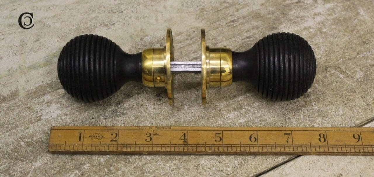 This beehive-style door knob set features ebonised wood paired with polished brass fittings for a striking, sophisticated look. The dark wood contrasts beautifully with the brass.