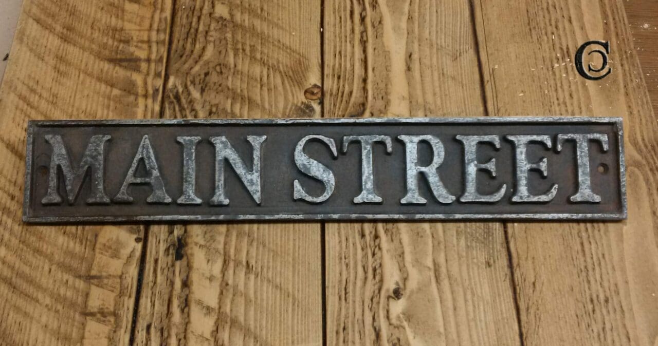 Add classic character to any property with this “MAIN STREET” wall plaque, crafted from solid cast iron and finished in a timeless antique style. Measuring 430mm x 70mm, this elongated sign features bold, raised lettering for a traditional and eye-catching look.